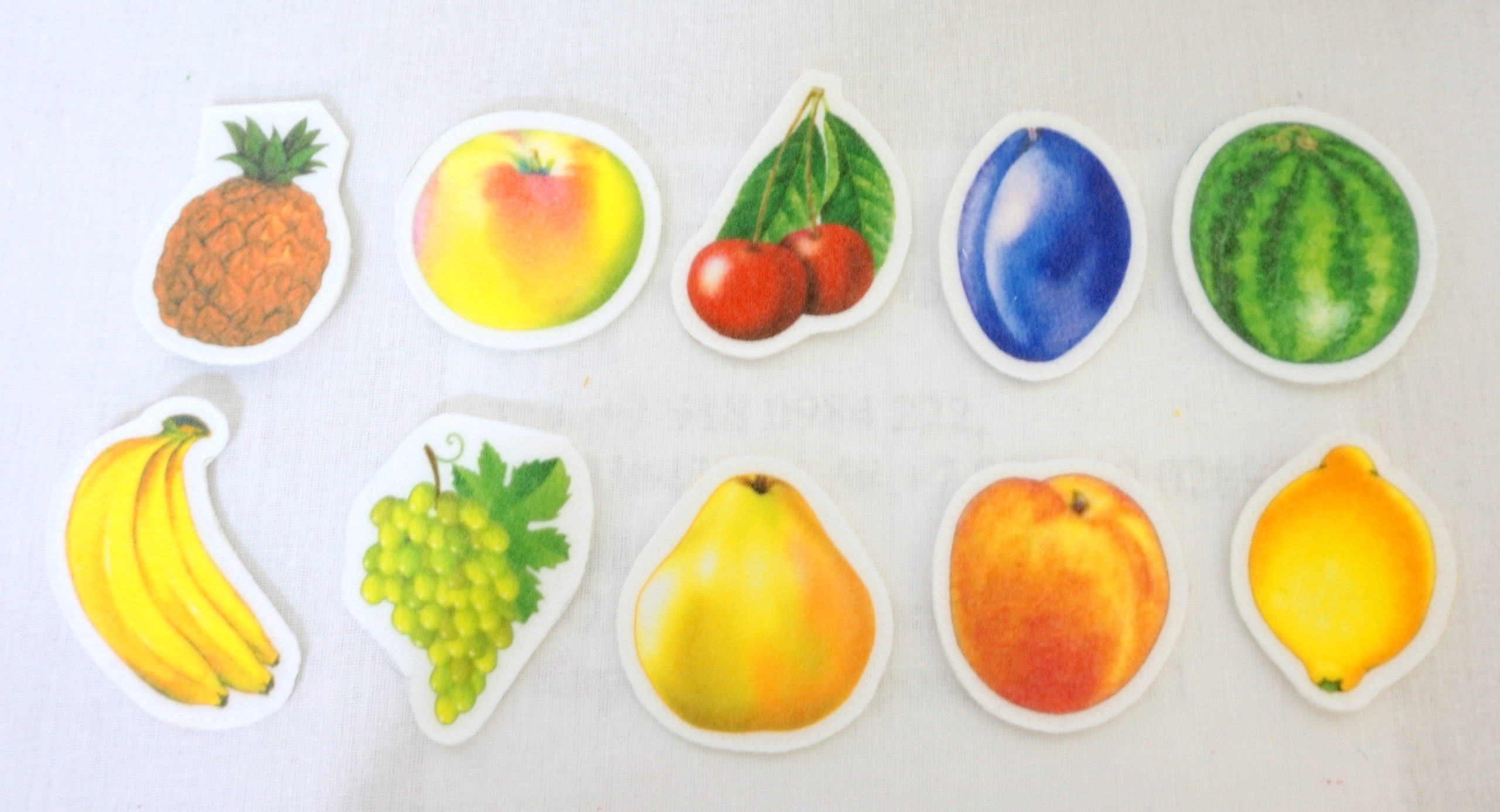 В наборе — яблоко, груша, банан, виноград, ананас, вишня, слива, персик, лимон, арбуз. Каждая фигура снабжена липучкой (лентой Velcro). Данный набор подходит для работы с игровым полем.