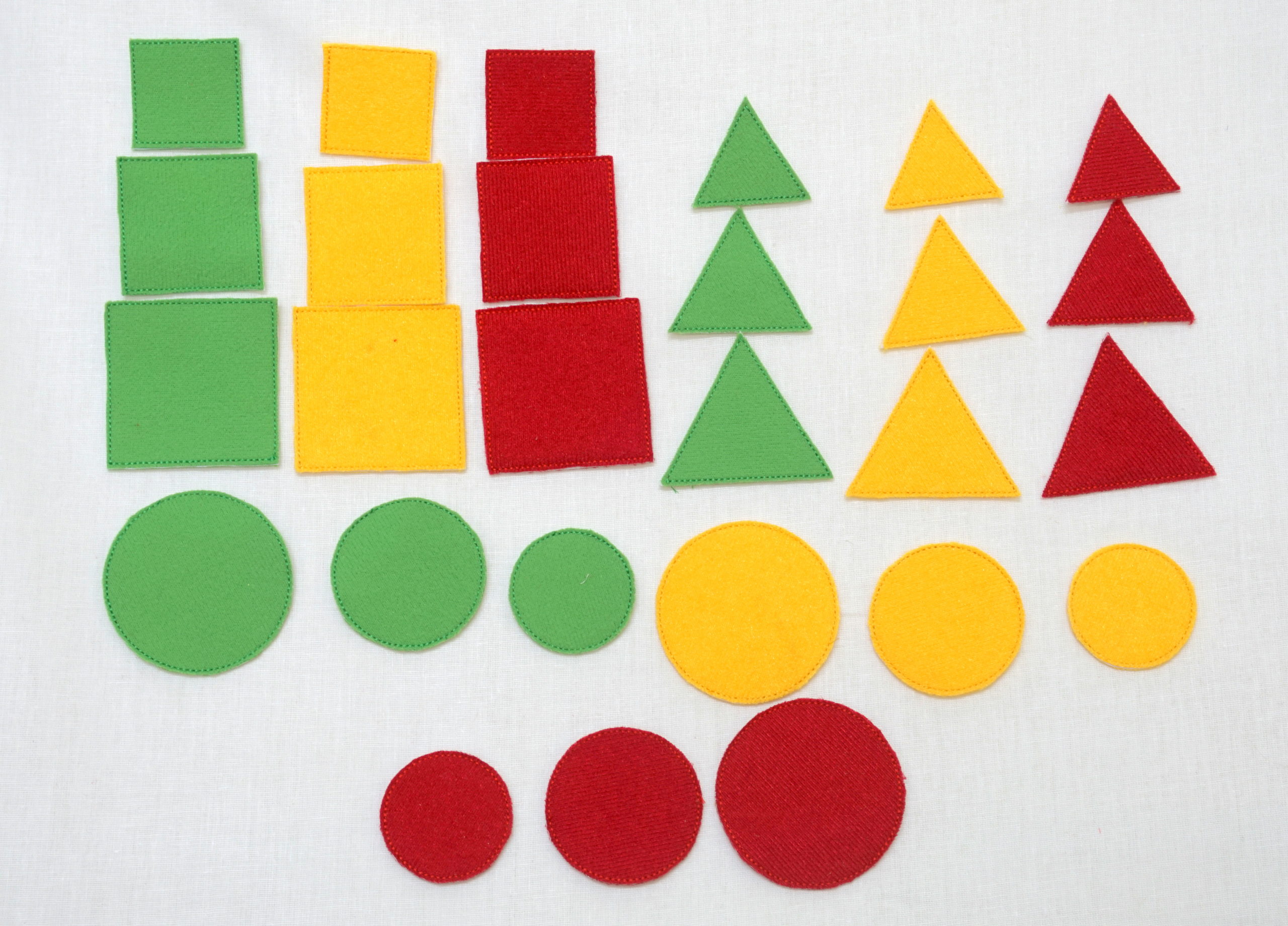 Набор содержит основные геометрические фигуры: круг, квадрат, треугольник. Все они разного размера и цвета. Каждая фигура снабжена липучкой (лентой Velcro). Данный набор подходит для работы с игровым полем.