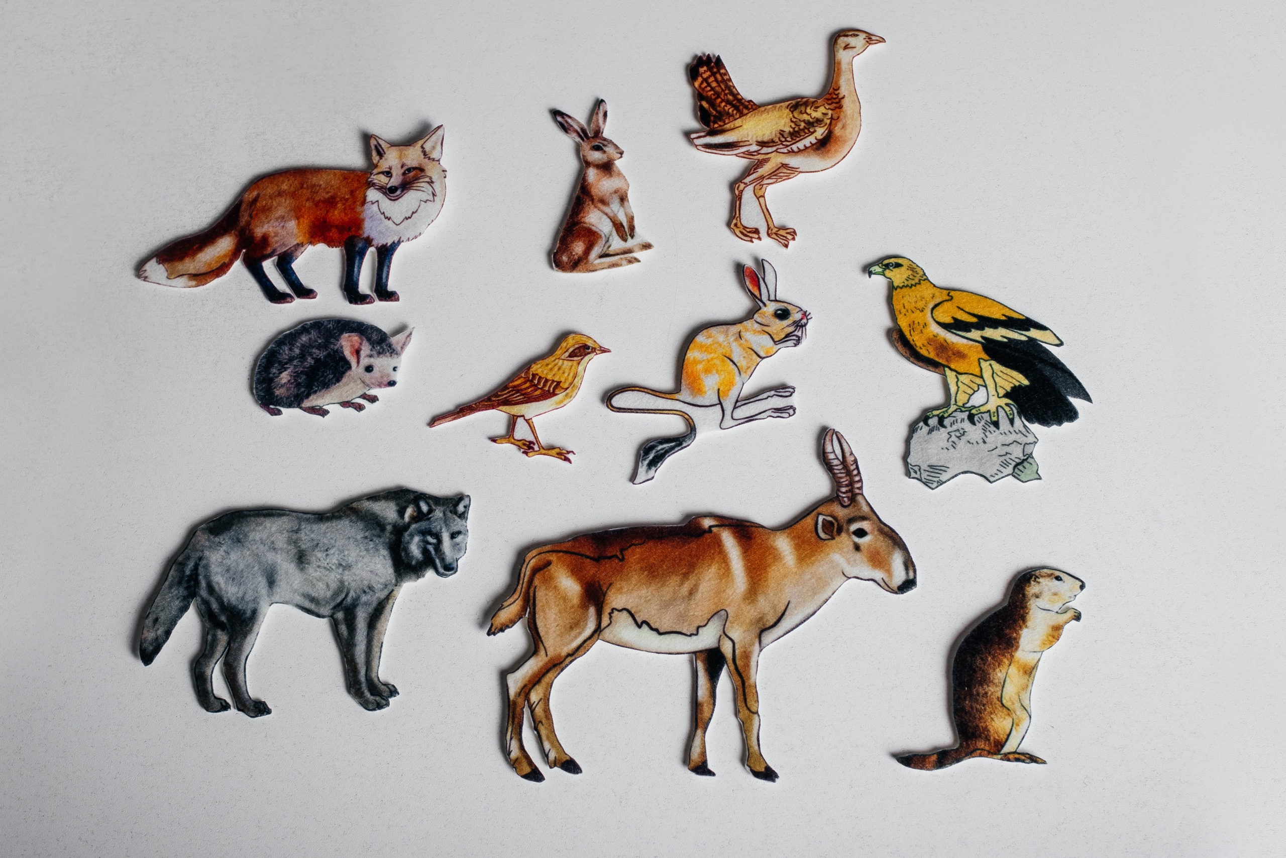 В набор входят: сайгак, дрофа, суслик, ушастый ёж, полевой жаворонок, орёл, степная лиса, степной волк, степной заяц, тушканчик. Каждое животное снабжено липучкой (лентой Velcro). Данный набор подходит для работы с игровым полем.