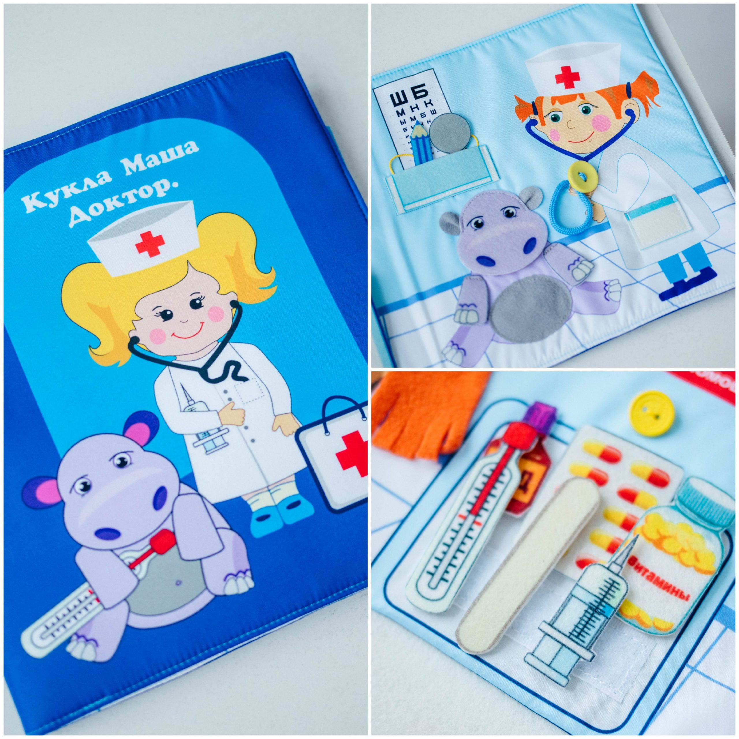 Вместе с куклой в игровой форме ребенок будет лечить своих друзей (можно послушать пациента, проверить горло, зрение, записать результаты), выучит названия медицинских приборов и препаратов.
