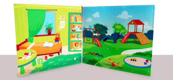 На 4 страницах изображены 2 детские комнаты и детская площадка для прогулок в разное время года: зима и лето. Страницы соединены разборными кольцами, что позволяет играть с каждой страницей книжки отдельно, а также использовать ее как декорацию. В набор входят фигурки мальчика, девочки и комплекты одежды для них. Высота кукол 19 см. Одежда и аксессуары позволяют подобрать образ для любого события или времени года. Комплекты одежды хранятся в кармане — странице. Всего в наборе 32 предмета.