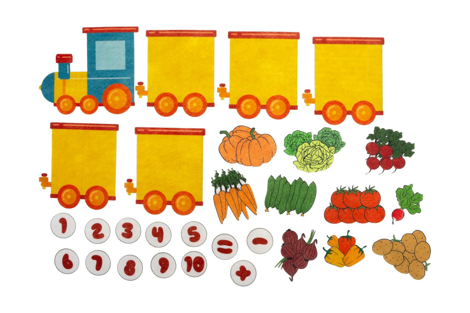 Фигурки паровозов, фигурки овощей, фигурки цифр.