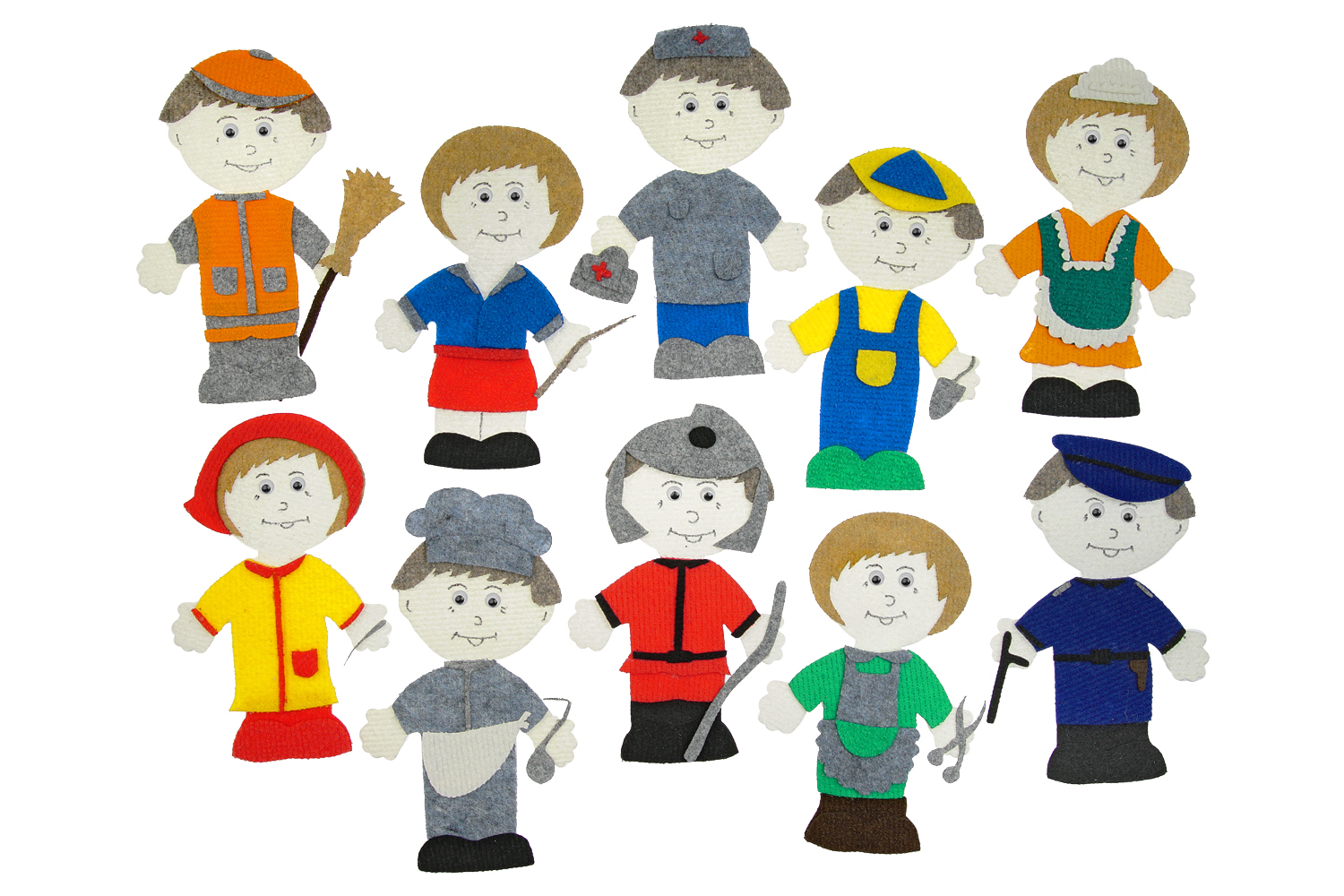 Врач, пожарный, полицейский, дворник, строитель, повар, швея, продавец, учитель, парикмахер. Фигурки 15*20см.