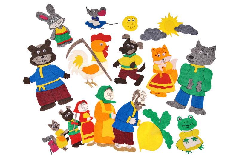 Дед, бабка, внучка, мышка -2шт., собачка - 2шт., кошка, заяц, лягушка, лиса, волк, петух, колобок, медведь, репка, солнце, облако 2-шт. Фигурки от 3*2см до 20*17см.