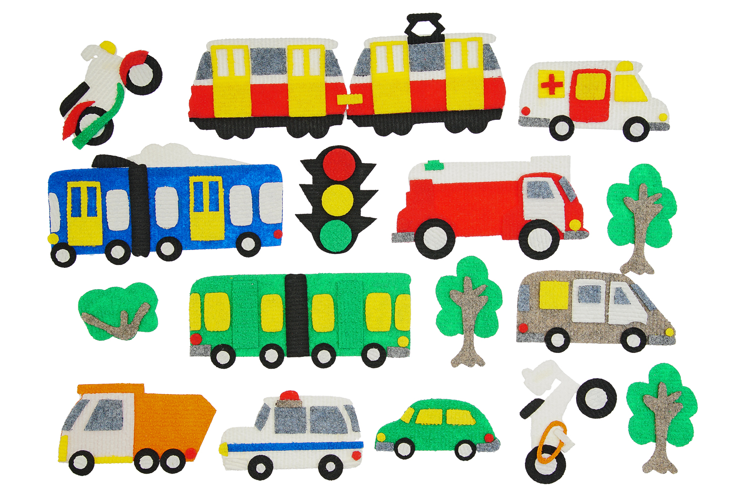 Автобус, троллейбус, грузовик, скорая помощь, полиция, пожарная, автомобиль, маршрутное такси, трамвай, мотоцикл, велосипед, светофор, куст, дерево-2шт., поле 25*35см. Фигурки от 3*3см до 12*20см.