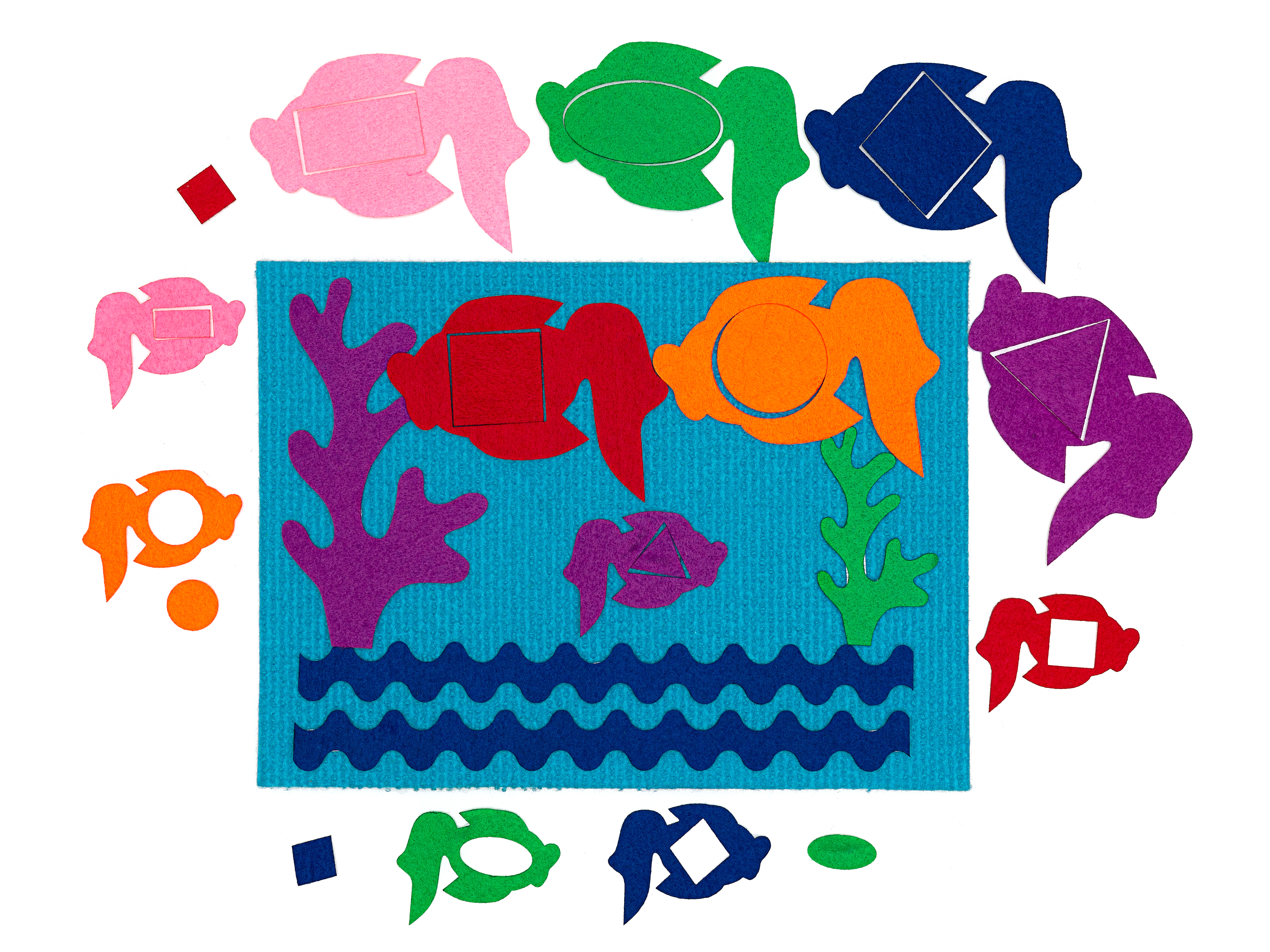 Игровое поле 28*20см, фигурки рыбки большие и маленькие, геометрические фигуры большие и маленькие, водоросли, волны.