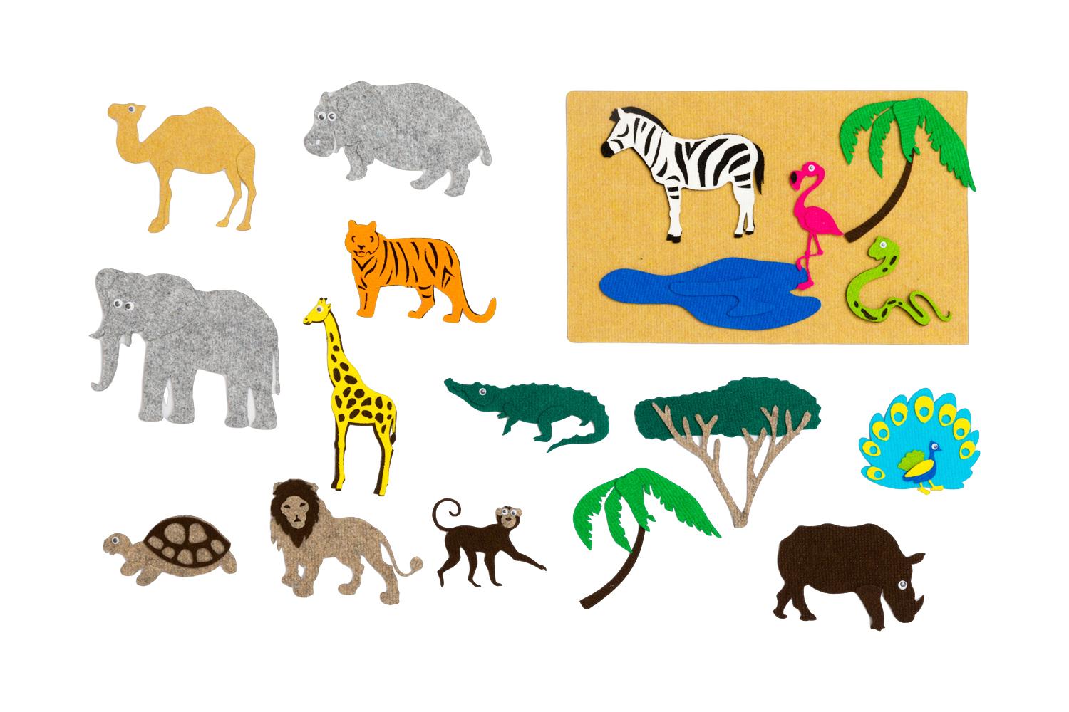 Зебра, лев, тигр, слон, жираф, обезьяна, павлин, крокодил, змея, черепаха, бегемот, носорог, фламинго, верблюд, пальма, кактус, дерево, озеро.Фигуркиот 2*2см до 20*20см. Поле 28*45см