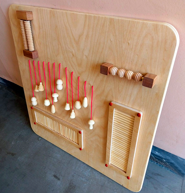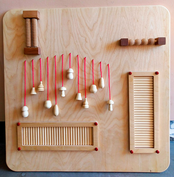 Настенная развивающая дидактическая панель. Элементы различных форм движутся попарно. Горизонтальная и вертикальная гребенки. Служит для стимуляции ассоциативного центра стереогнозии.