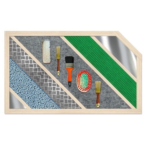 Панель состоит из набора кисточек разной жесткости, а также из поверхностей с различными текстурами покрытия. Размер: 65*40см. Материалы: фанера, дерево, пластик, ковролин