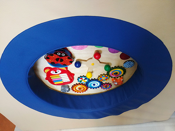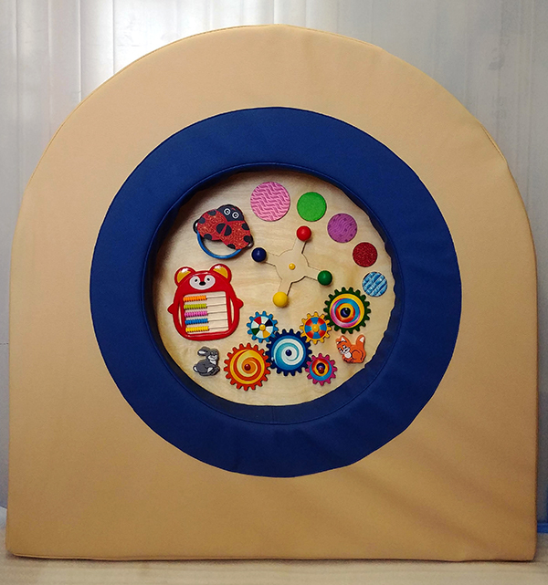 Мягкая настенная дидактическая панель. В полукруге из поролона, обитого экокожей расположено игровое поле с развивающими элементами. Вращающиеся шестерни, счеты, бубен, волчок, фрагменты поверхностей с разными тактильными ощущениями. Окантовка двухцветная, синий круг по центру и бежевая эко кожа по периметру.