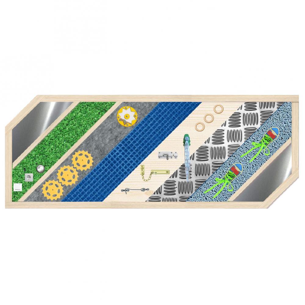 На панелях размещены тактильные элементы различных форм, размеров, фактуры и цветов (из ткани, дерева, металла, пластика), игровые элементы, и т. п., которые научат ребёнка различать и сравнивать между собой свойства (цвета, формы, размеры, текстуру, звуки), направления в пространстве. Размер: 100*40см