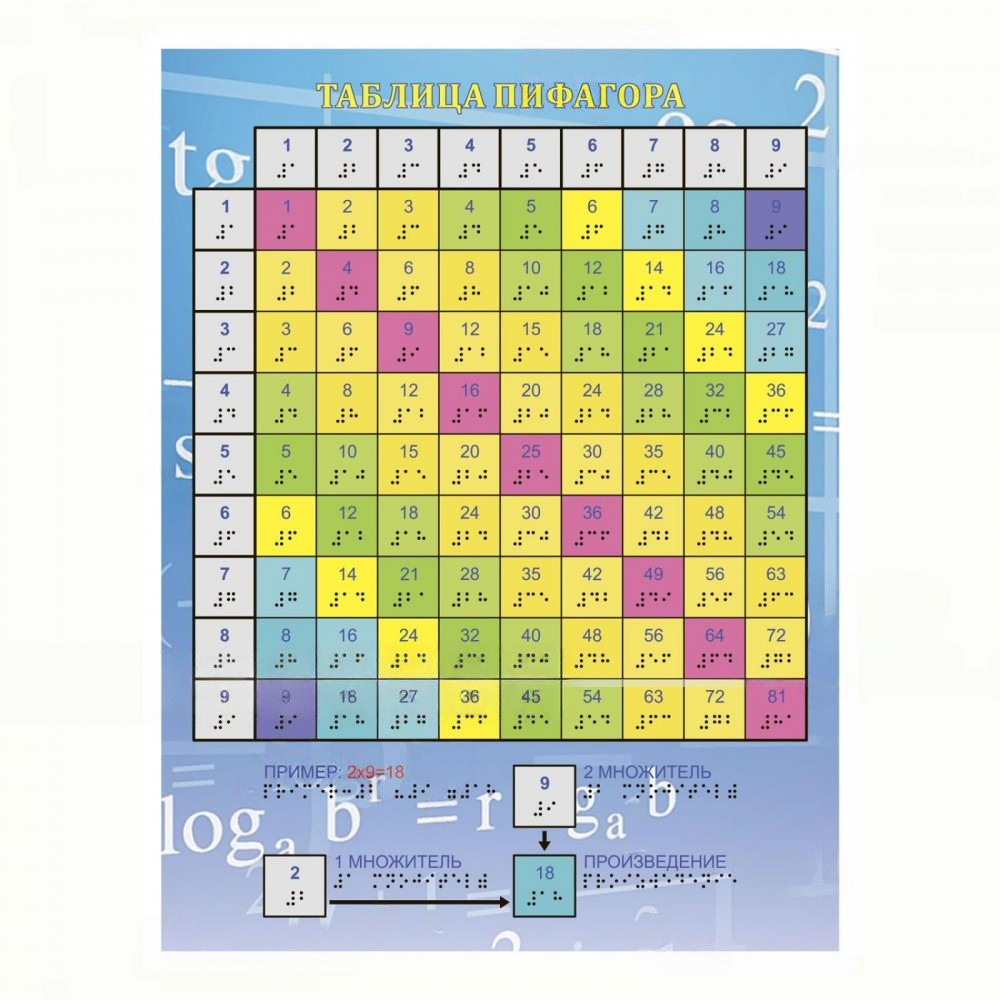 Тактильная таблица Пифагора разработана тифлоспециалистами специально для образовательных учреждений, работающих по системе инклюзивного образования. Вся информация на таблице продублирована точечным шрифтом по системе Брайля, что делает ее доступной для тотально незрячих и слабовидящих детей.