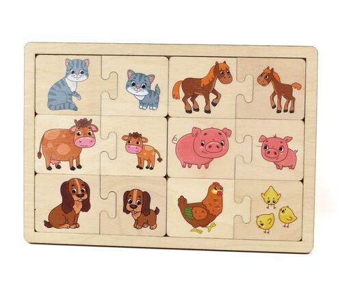 На 12 элементах пазла размерами 57х50 мм нанесены изображения взрослых животных и их детёнышей. Вот кошка, а вот её котёнок. Вот курочка, а вот её цыплёнок.