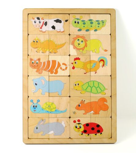 Пазл деревянный «Весёлые половинки». Состав: планшет (248 х 172 х 8 мм), фишки – 24 шт. (38 х 38 х 4 мм). Материал: дерево. На деревянные фишки нанесены картинки с половинками животных. Рекомендовано для детей от 3 лет. Развивает мелкую моторику рук, координацию движений, усидчивость, логику, воображение и память.