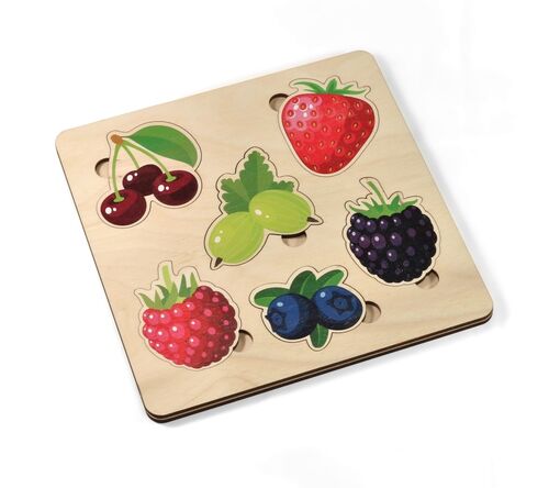 Деревянный пазл «Ягоды» — это простая развивающая игра для малышей от 3-х лет.