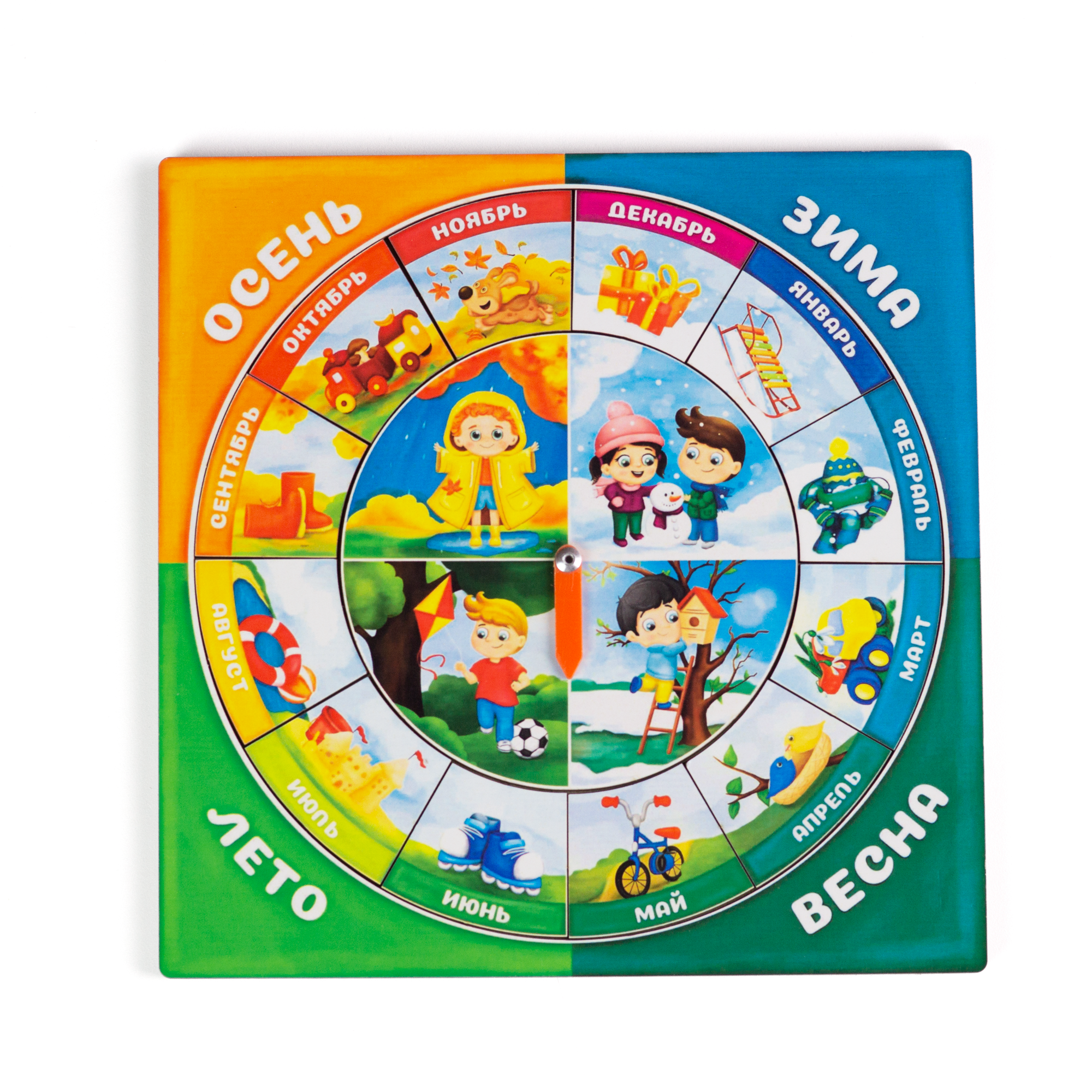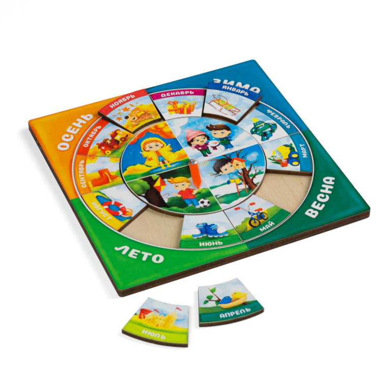Эта привлекательная игрушка, познакомит ребенка с календарем. Малыш научится внимательно наблюдать за окружающим миром и природными явлениями, легко запомнит названия и особенности времен года, названия месяцев. Крутите стрелку и рассказывайте о лете, осени, зиме и весне.