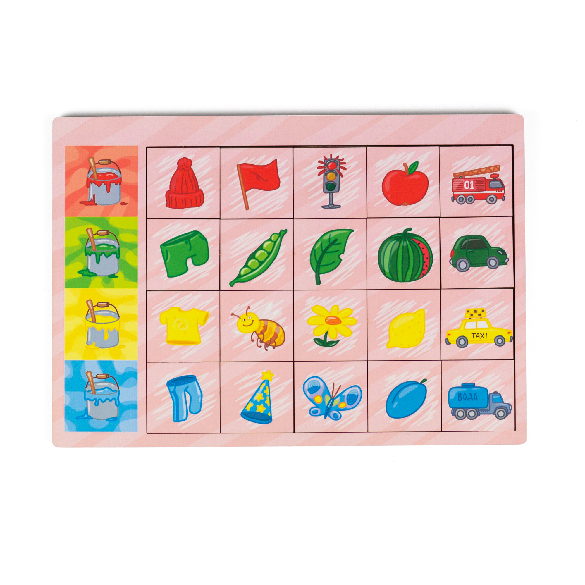 Деревянная панель с квадратами, на которых изображены четыре ведерка с краской разных цветов. Красный, зеленый, желтый, синий. Квадраты в ряд (всего 4 ряда) с предметами, окрашенными в эти цвета.