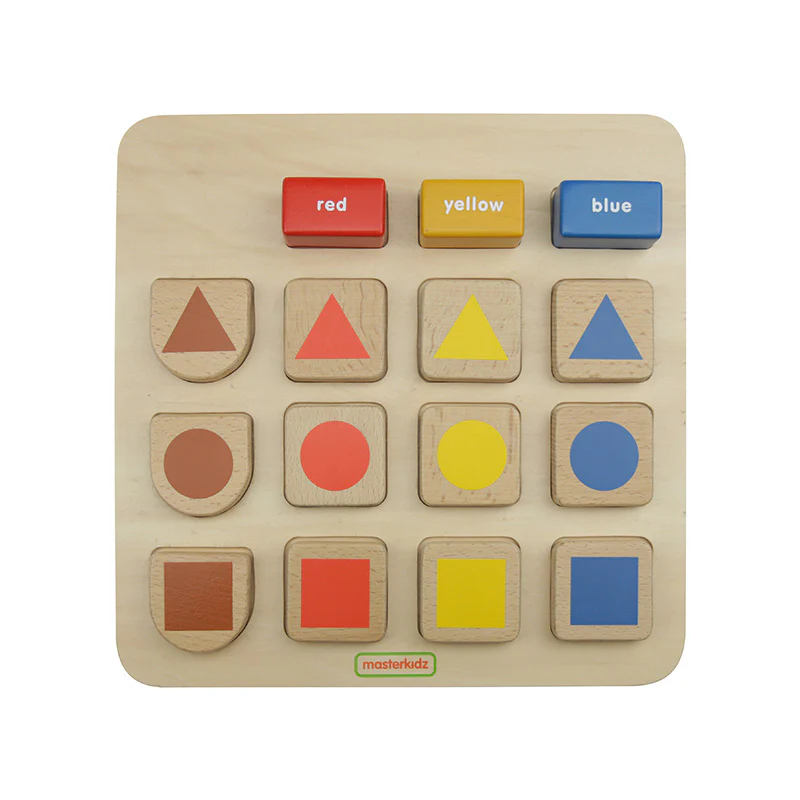 Основание панели из березовой фанеры, на лицевой части представлены деревянные блоки разных геометрических форм. Детям предлагается сопоставить блоки в соответствии с цветами в верхней части панели, либо разместить блоки правильно в соответствующие выемки - углубления.