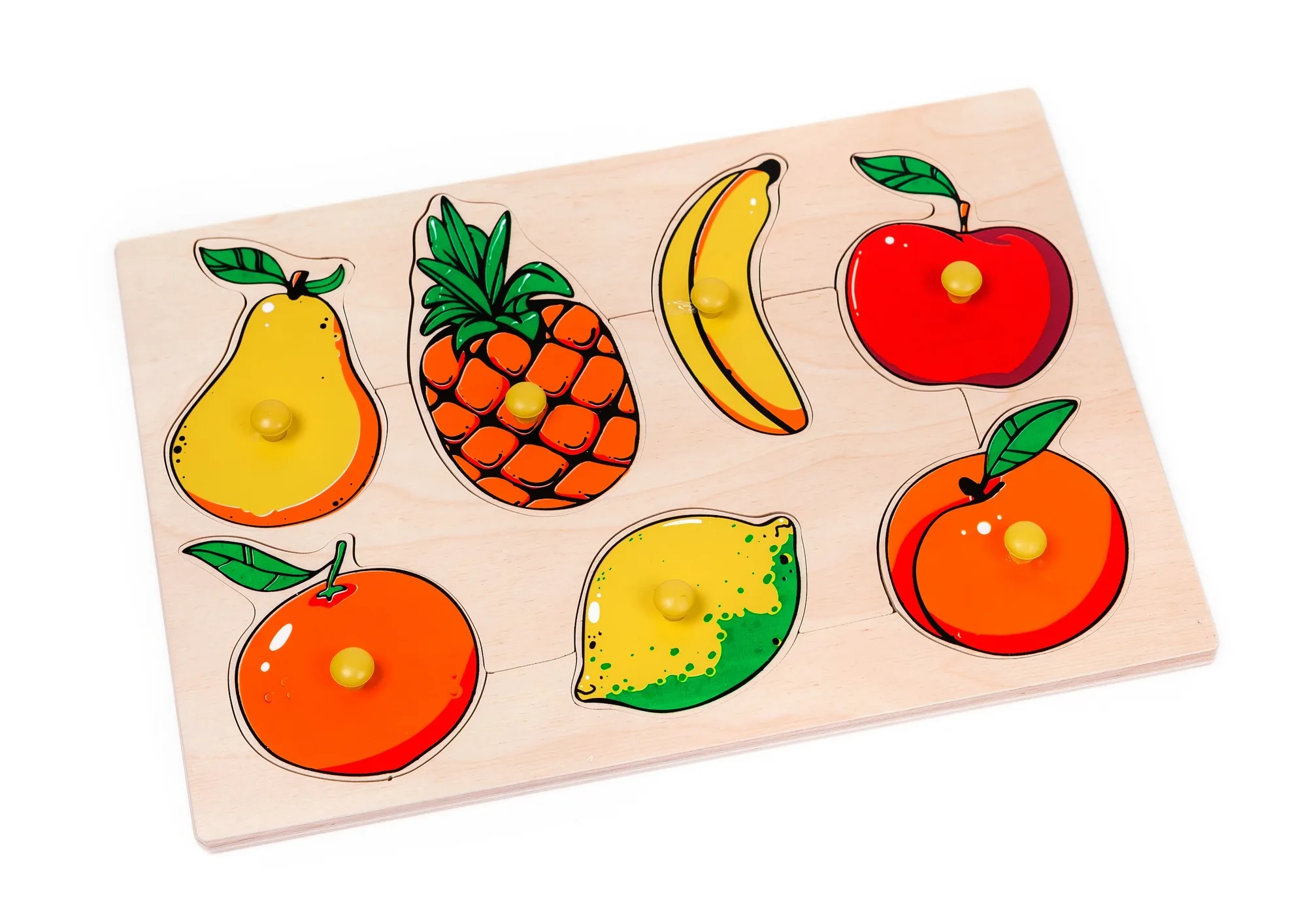 Деревянная рамка с ячейками, в которых изображены разрезанные фрукты. Для каждой ячейки предусмотрен вкладыш с изображением соответствующего целого фрукта. Каждый вкладыш снабжен удобной желтой ручкой.