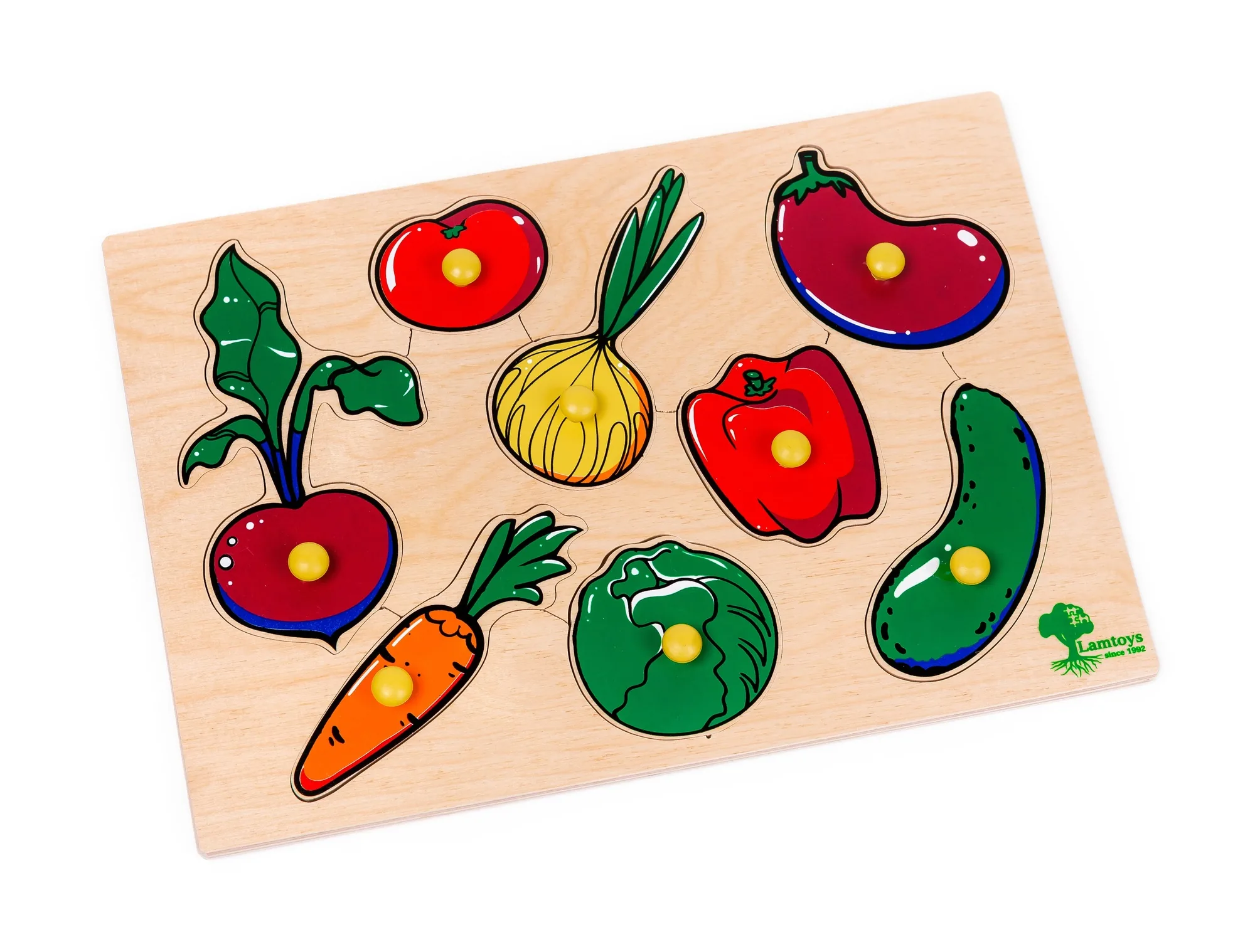 Деревянная рамка с ячейками, в которых изображены разрезанные овощи. Для каждой ячейки предусмотрен вкладыш с изображением соответствующего целого овоща. Каждый вкладыш снабжен удобной желтой ручкой.