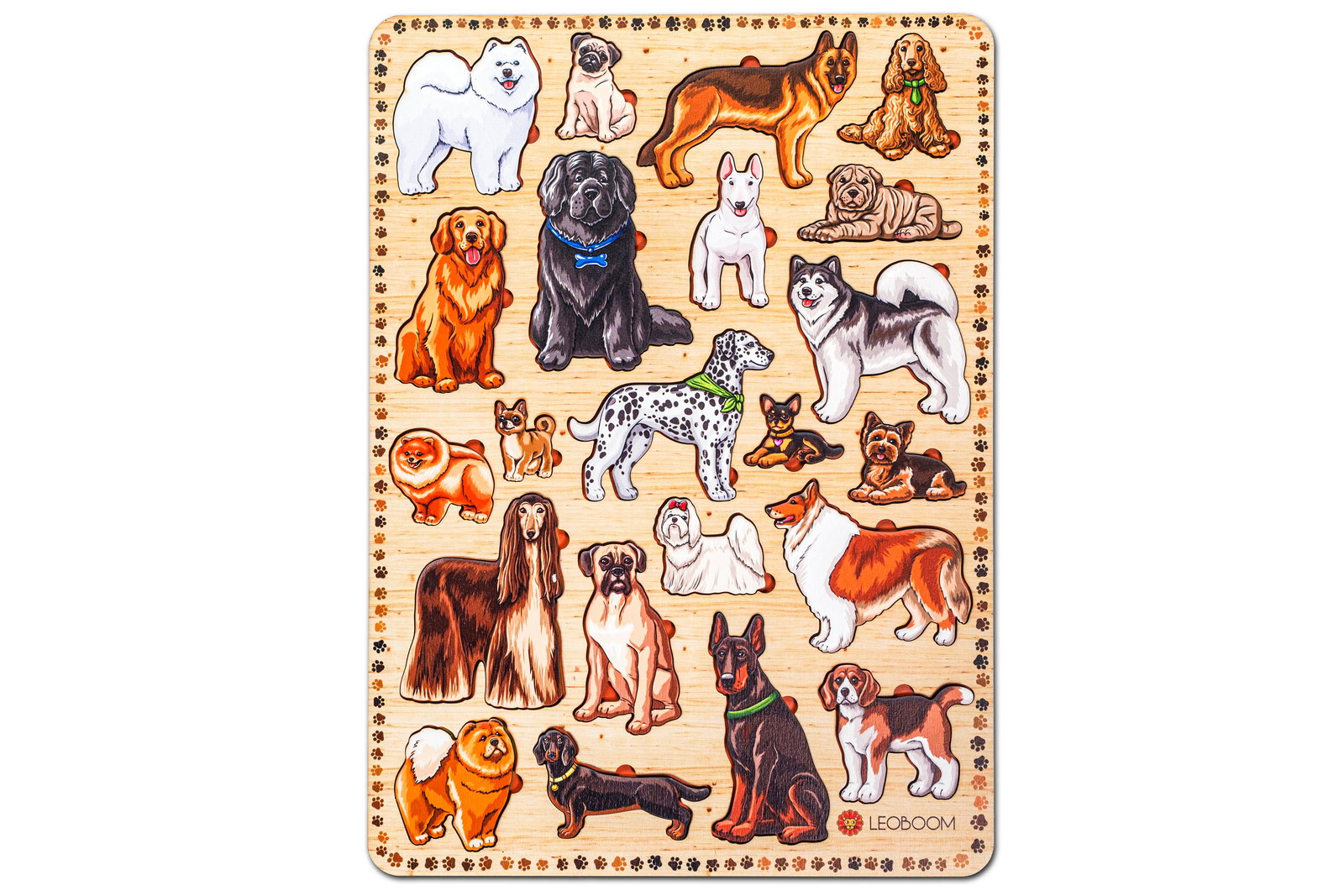 1. Игра «Добро пожаловать на выставку!» Предложите ребенку «отправиться» на выставку собак, чтобы познакомиться с разными породами. Рассмотрите вкладыши вместе с ребенком, изучите породы собак, запомните их названия, обсудите внешние особенности каждой породы, характер, повадки. Попробуйте определить, к какой группе относятся представленные породы: служебные (немецкая овчарка, водолаз, хаски); охотничьи (лайка, афганская борзая, такса, ретривер, спаниель, бигль); сторожевые (боксер, доберман); декоративные (йоркширский терьер, шпиц, мопс) и т.п. Объясните назначение каждой группы пород. Придумайте клички для каждой собаки, представленной на вкладышах.