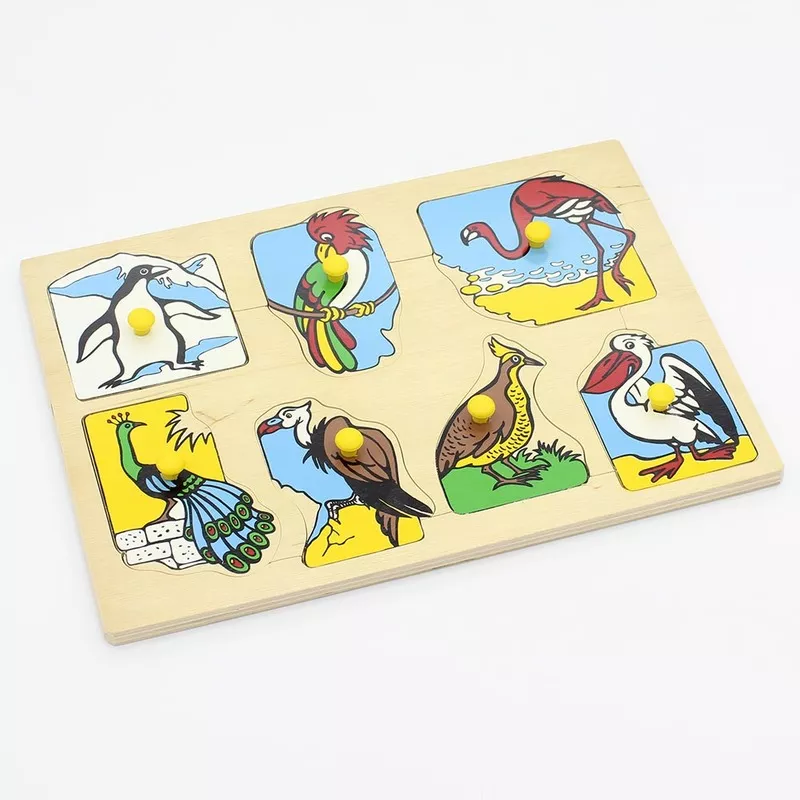 Логическая разборная рамка-вкладыш состоит из семи вкладок, каждая из которых снабжена удобной ручкой. На каждой из них изображены птицы, обитающие в далеких от нас местах: пингвин, попугай, фламинго, павлин, грифон, фазан и пеликан.