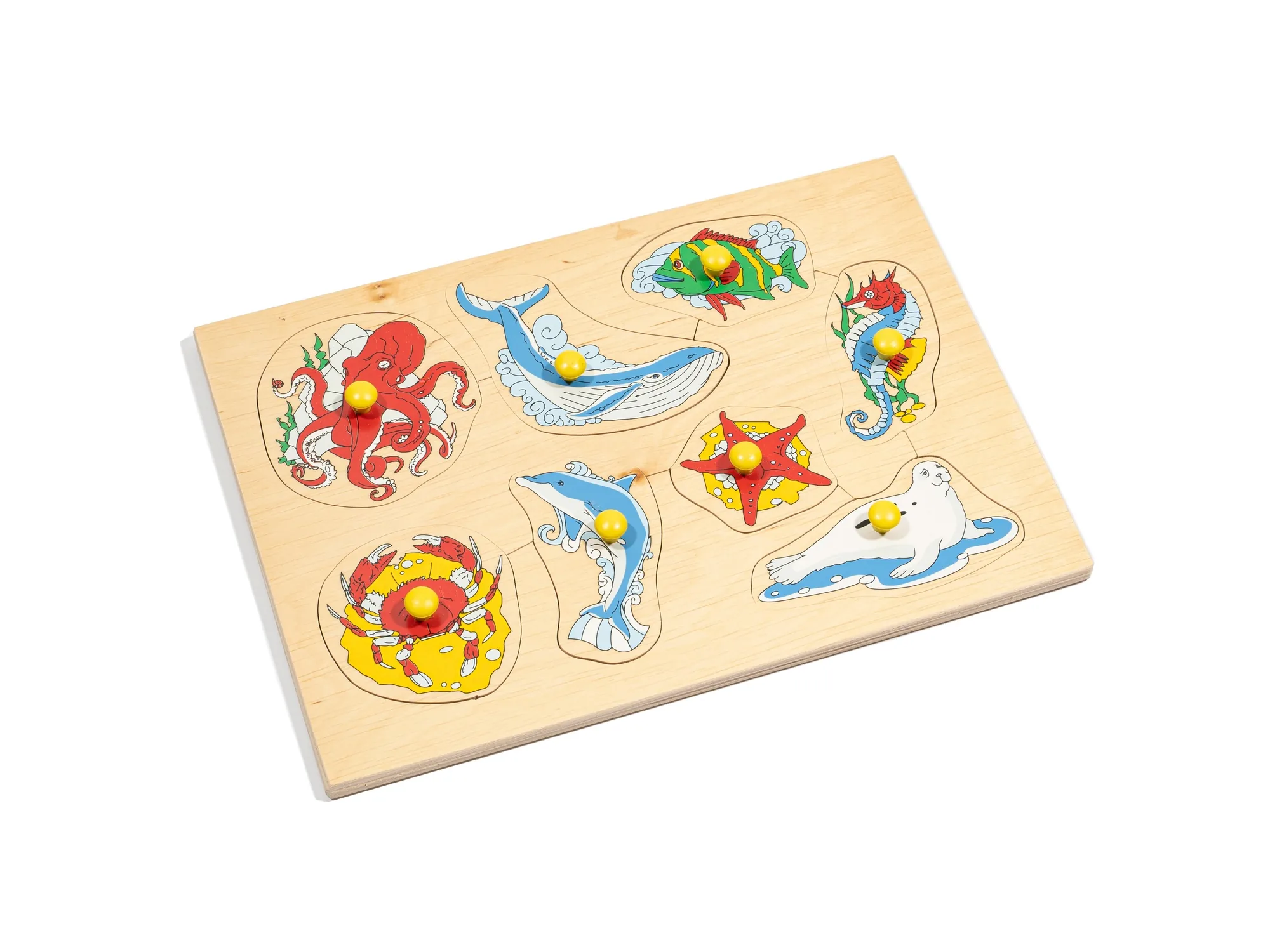 Деревянная рамка с ячейками, в которых изображены обитатели водного мира. Для каждой ячейки предусмотрен вкладыш с изображением морского животного. Каждый вкладыш снабжен удобной желтой ручкой.