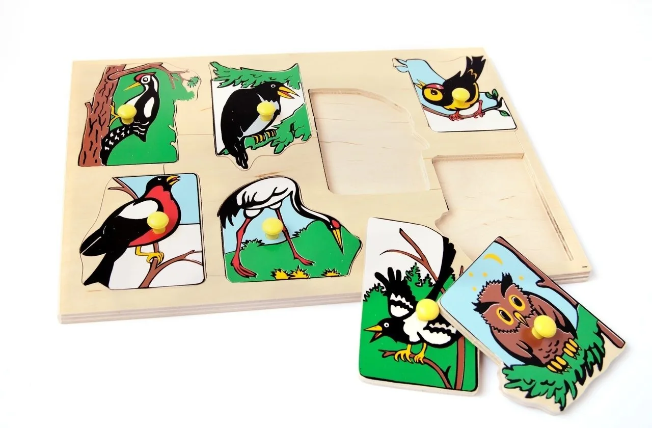 Логическая разборная рамка-вкладыш состоит из семи вкладок, каждая из которых снабжена удобной ручкой. На каждой из них изображены птицы, обитающие в наших лесах: дятел, ворона, сорока, снегирь, сова, цапля и синица.