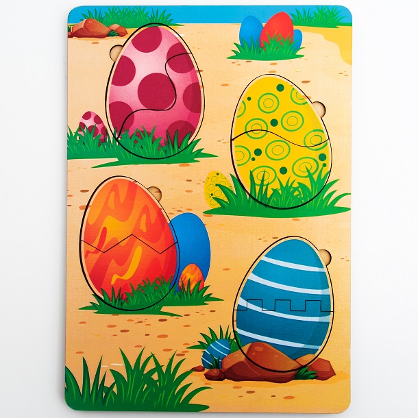 Взрослый раскладывает все детали яиц на стол и предлагает собрать все яйца.
