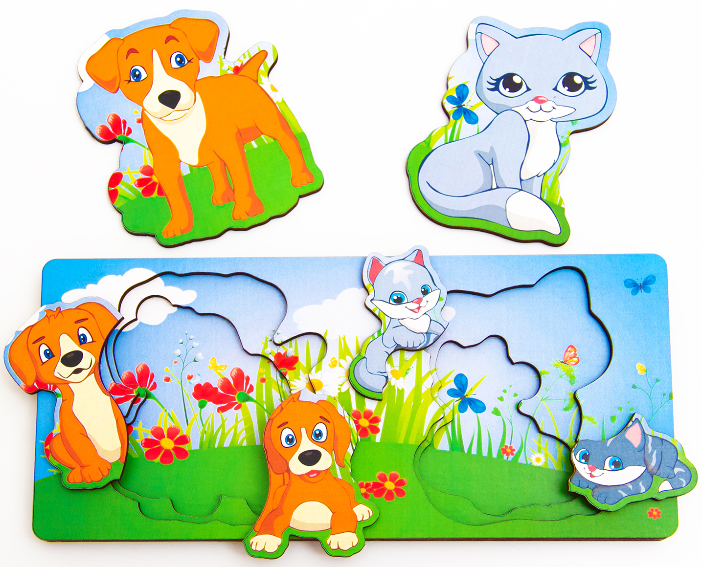 Вкладыш многоуровневый Собака и кошка изготовлен из дерева – экологически чистого и гипоаллергенного материала.