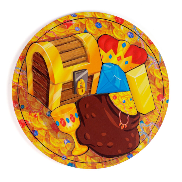 Фигурки, имитирующие различные сокровища: сундук, корона, алмаз, слиток золота, мешок с золотом, чаша золотая.