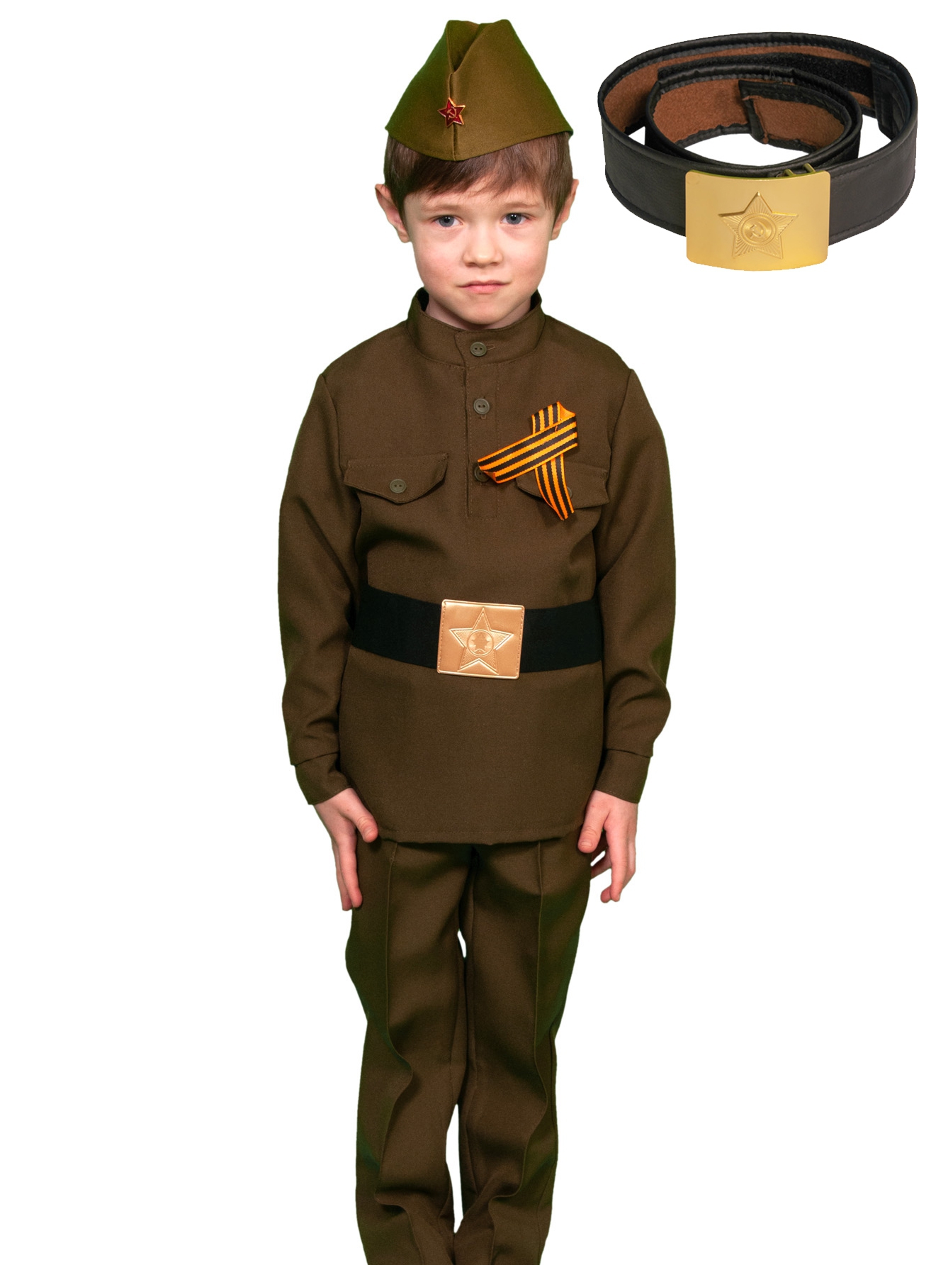 Пилотка, гимнастёрка, ремень из кожзама с металлической пряжкой, брюки + георгиевский бант