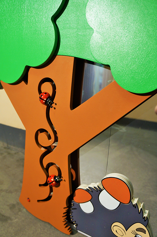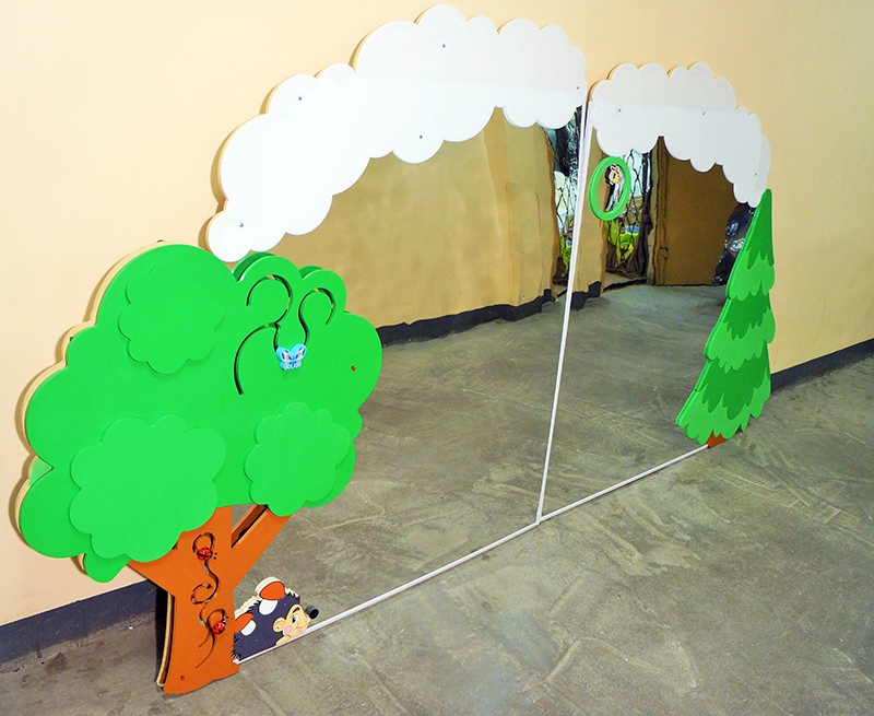 Зеркальная стена, выполненная из безопасного зеркального пластика с декоративными элементами, окрашенными ВД краской. Все дополнительные элементы выполнены из дерева, облака из безопасного оргстекла.