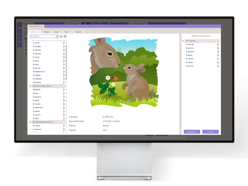 Специалист может пополнять библиотеку программы, загружая свои изображения/видео/аудио/тексты.