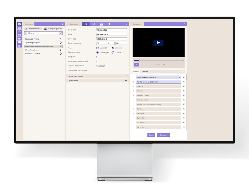 Программное обеспечение позволяет создавать базу данных, в которой сохраняются индивидуальные настройки, результаты калибровок и игр.
