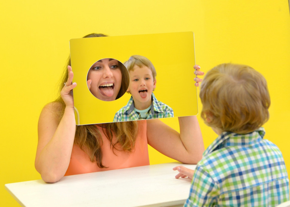 Все гениальное просто. Ребенок одновременно видит свое отражение в зеркале и рядом видит правильную артикуляцию логопеда.